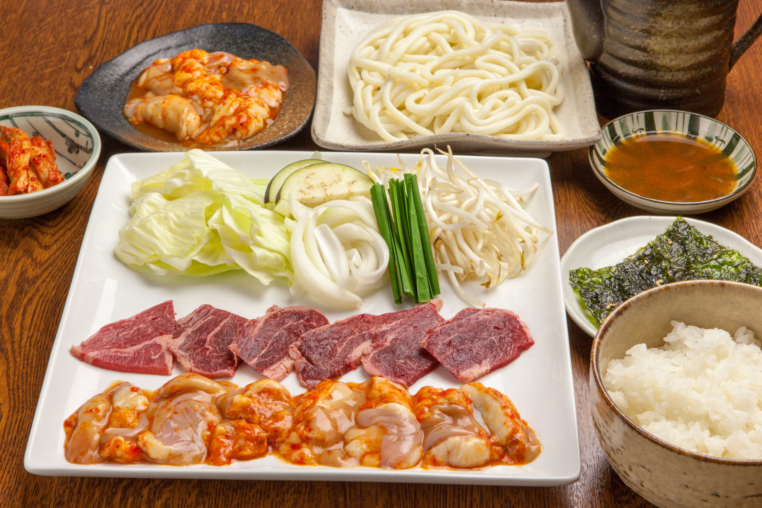 上バラ1人前・ホルモン1人前・野菜盛・ごはん・キムチ・〆のホルモンうどん